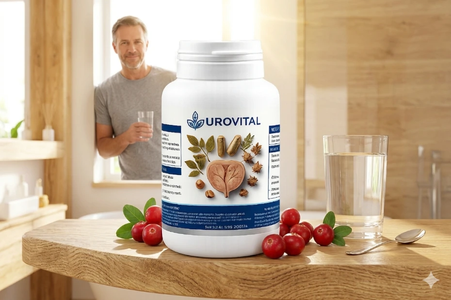 Os nossos produtos, como o Urovital visível nesta imagem ao lado de ingredientes naturais frescos, são formulados para integrar-se perfeitamente à sua rotina diária de saúde. Ao fornecer um suporte focado na manutenção do equilíbrio interno, especialmente para o sistema urinário, eles ajudam a promover uma sensação sustentada de conforto, vitalidade e bem-estar geral, permitindo que você desfrute de cada dia com mais confiança e tranquilidade.